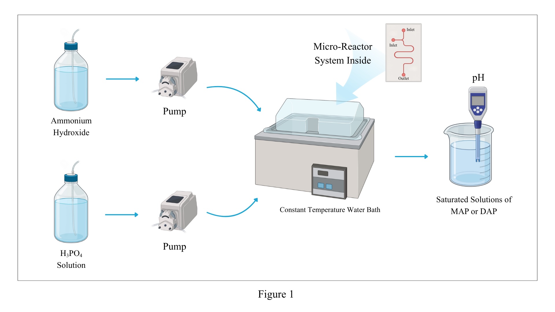 O primeiro estudo investigou a síntese contínua de fosfato monoamônico (MAPA) e fosfato de diamônio (DAP) soluções usando um reator de microcanais. Como mostrado na Figura 1, Amônia aquosa e ácido fosfórico foram dosados em um micromisturador e reagiram em um microcanal tubular com 1 mm de diâmetro interno. A composição do produto foi controlada ajustando-se a proporção ácido-base, com monitoramento de pH em tempo real para obter a formulação desejada de MAP ou DAP. conforme mostrado na Figura 2..