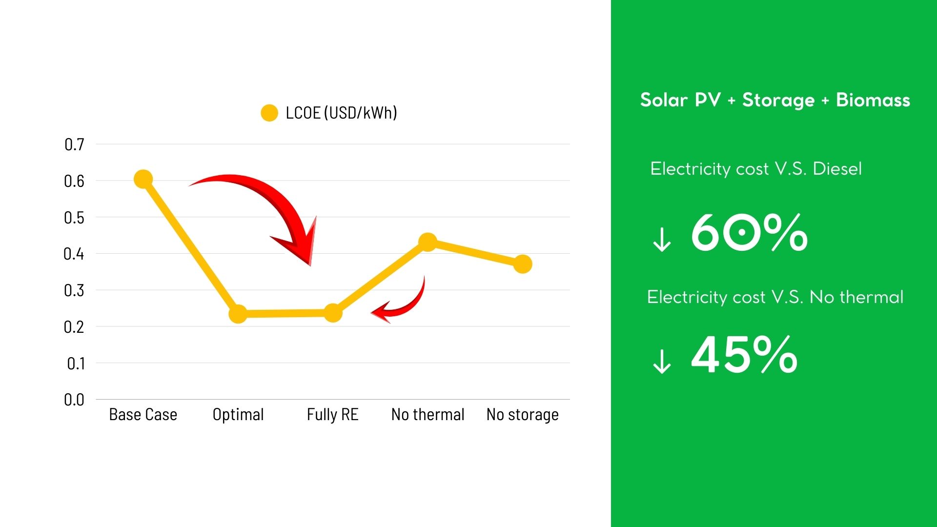 Compared with diesel-based systems, the levelized cost of electricity can decrease by up to 60.8%.Compared with a pure solar-plus-battery configuration, LCOE can fall by 45%.