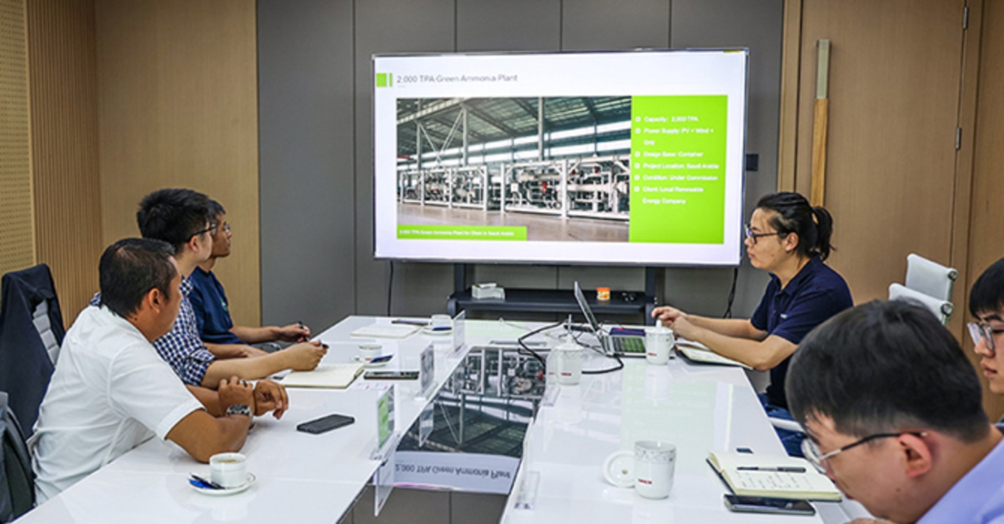 Após a troca, a gerência do projeto BCE foi até nossa base de fabricação de equipamentos para visitar a recém-desenvolvida planta de produção de amônia verde da KAPSOM e obter uma compreensão profunda do fluxo do processo, dos parâmetros do equipamento e do sistema de controle deste equipamento.