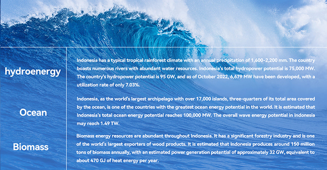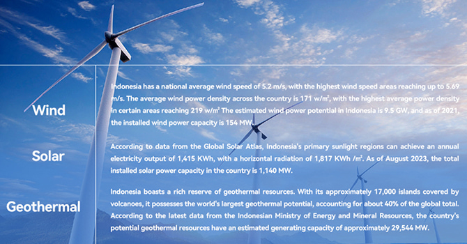 A Indonésia, o quarto país mais populoso do mundo, a principal economia do Sudeste Asiático e um polo regional de carvão, é impulsionada por sua imensa população e rápido crescimento econômico, que levaram a um aumento contínuo em sua demanda por eletricidade. Seguindo a tendência global de "descarbonização", a Indonésia também começou a buscar a transformação e o desenvolvimento de sistemas de energia verde e sustentável. O país se comprometeu a atingir uma participação de 23% de energia nova e renovável em sua estrutura energética nacional até 2025 e visa atingir a neutralidade de carbono até 2060.
