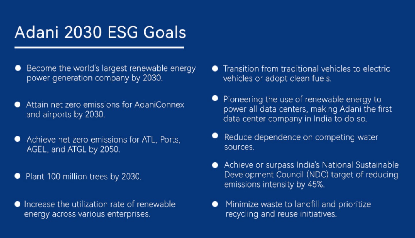O Sr. Gautam Adani, fundador e diretor do Adani Group, incorpora uma filosofia central centrada em incutir "virtude" em sua visão de construção nacional. Cada um dos negócios do grupo se dedica a promover capacidades de infraestrutura de classe mundial, contribuindo para a aceleração do crescimento da Índia. Na busca pela concretização dos Objetivos de Desenvolvimento Sustentável das Nações Unidas, a Índia está posicionada para desempenhar um papel fundamental em diversos campos. O sucesso na consecução dos 17 Objetivos de Desenvolvimento Sustentável está intimamente ligado à implementação abrangente da "Agenda 2030 para o Desenvolvimento Sustentável". O Adani Group aspira posicionar a Índia como um ator-chave no setor de energia sustentável, investindo em ecossistemas renováveis, abrangendo fabricação de energia solar, geração de energia, parques solares e energia de hidrogênio.